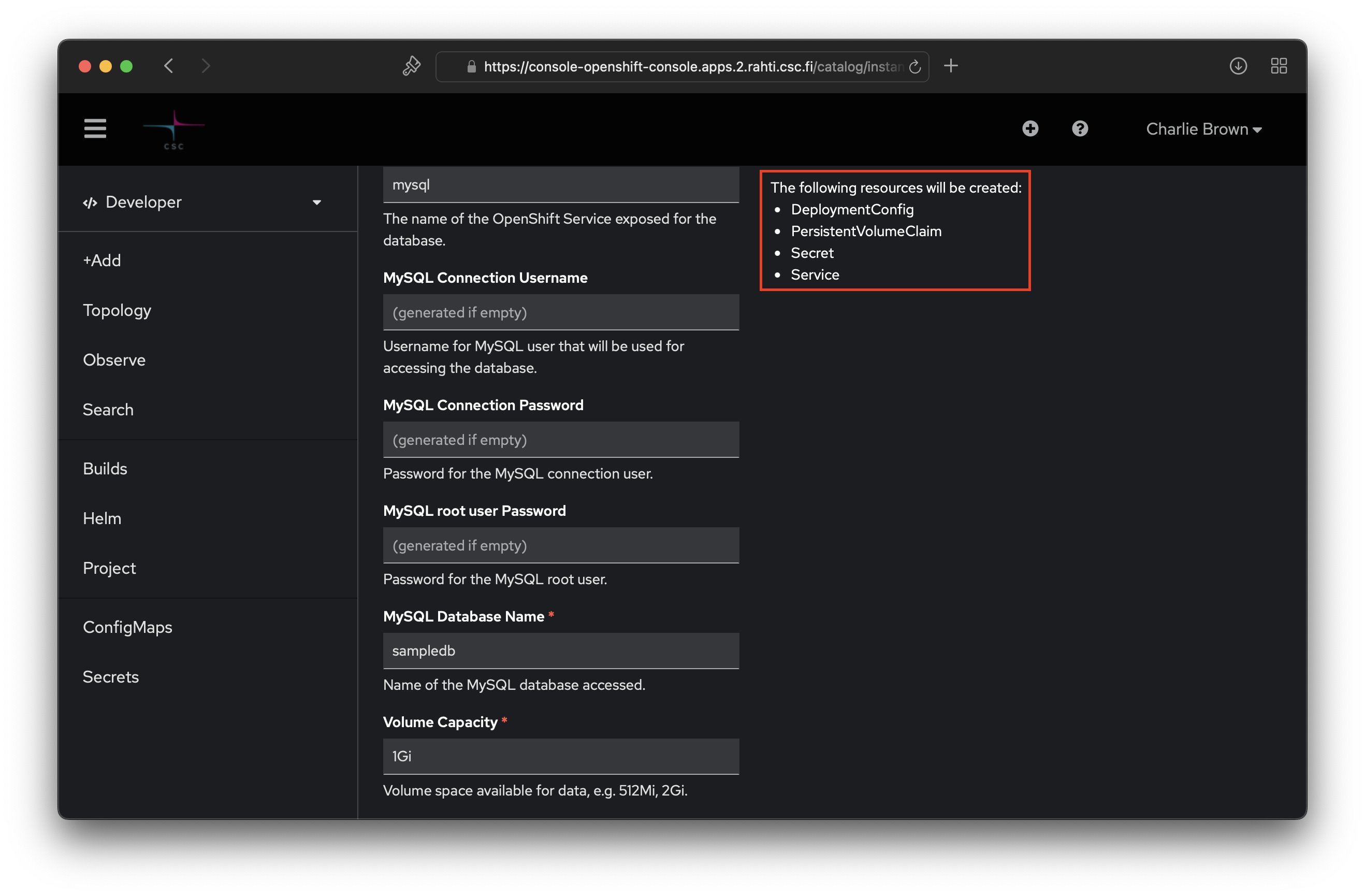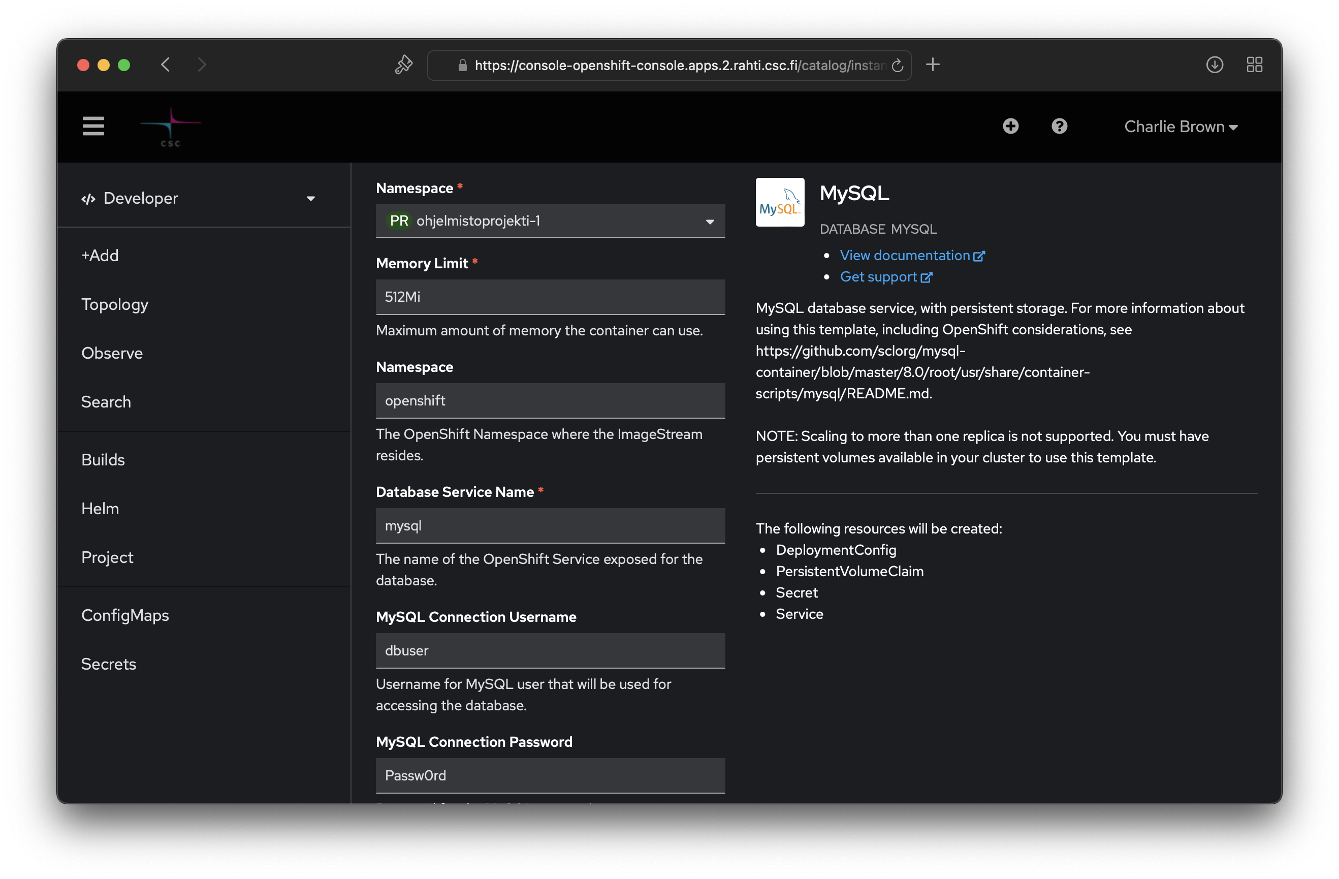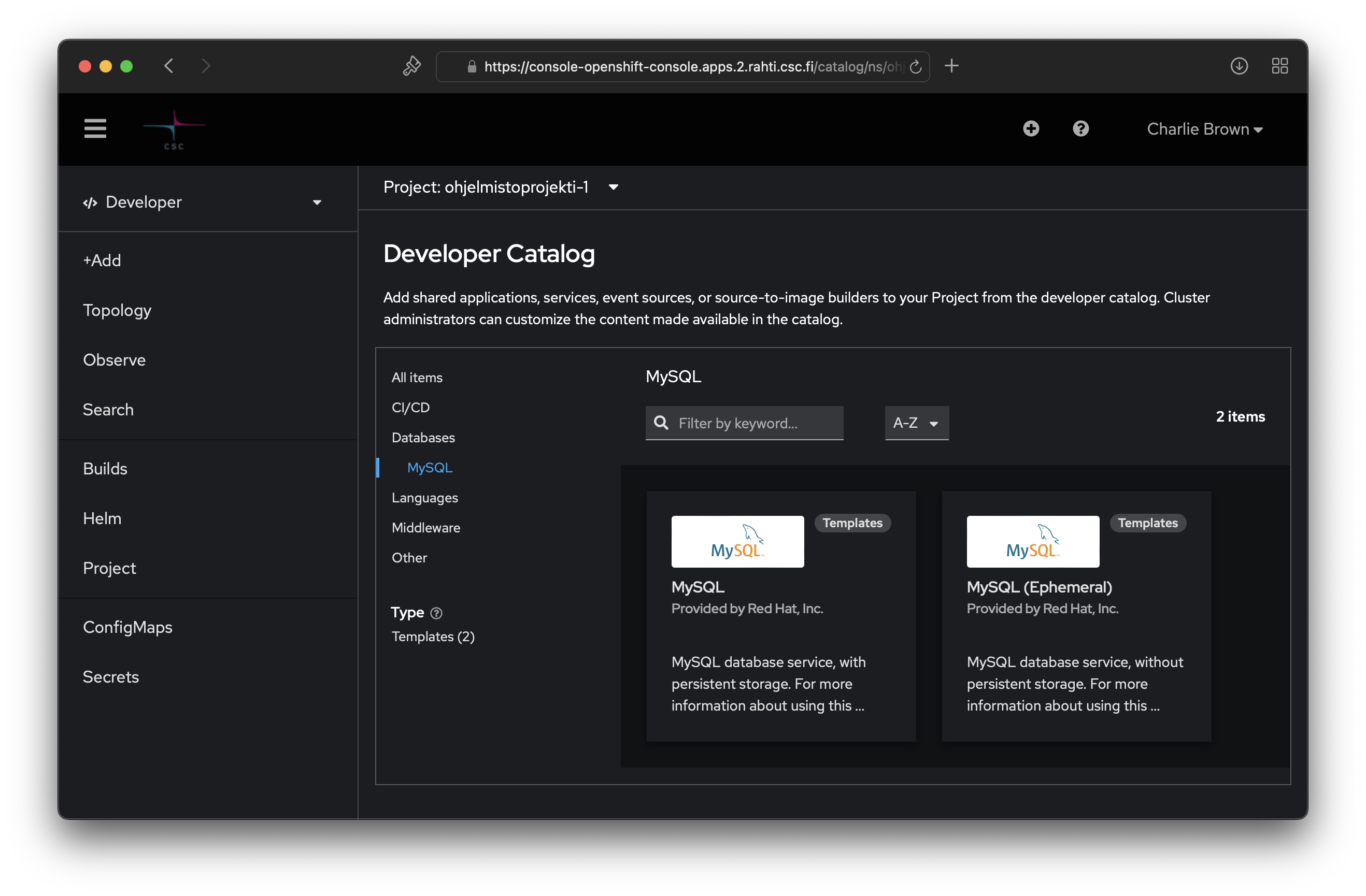 Huom! Tarjolla olevat Ephemeral-versiot tietokantapalveluista käyttävät pelkästään väliaikaista tallennuskapasiteettia ja kaikki mahdolliset muutokset mm. tietokantaan häviävät samalla, kun kontin suoritus loppuu. Pysyvää tallennusta varten tulee valita "tavallinen" tietokantapalvelukontti ja sille dedikoitu Persistent Volume Claim (PVC) -tallennustila.