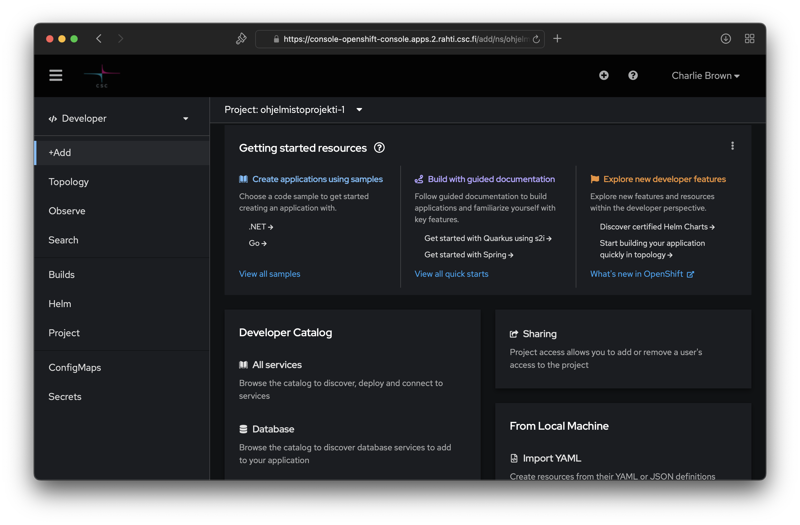Rahti-projektiin voi lisätä esivalmisteltuja kontteja Developer/+Add-näkymästä: