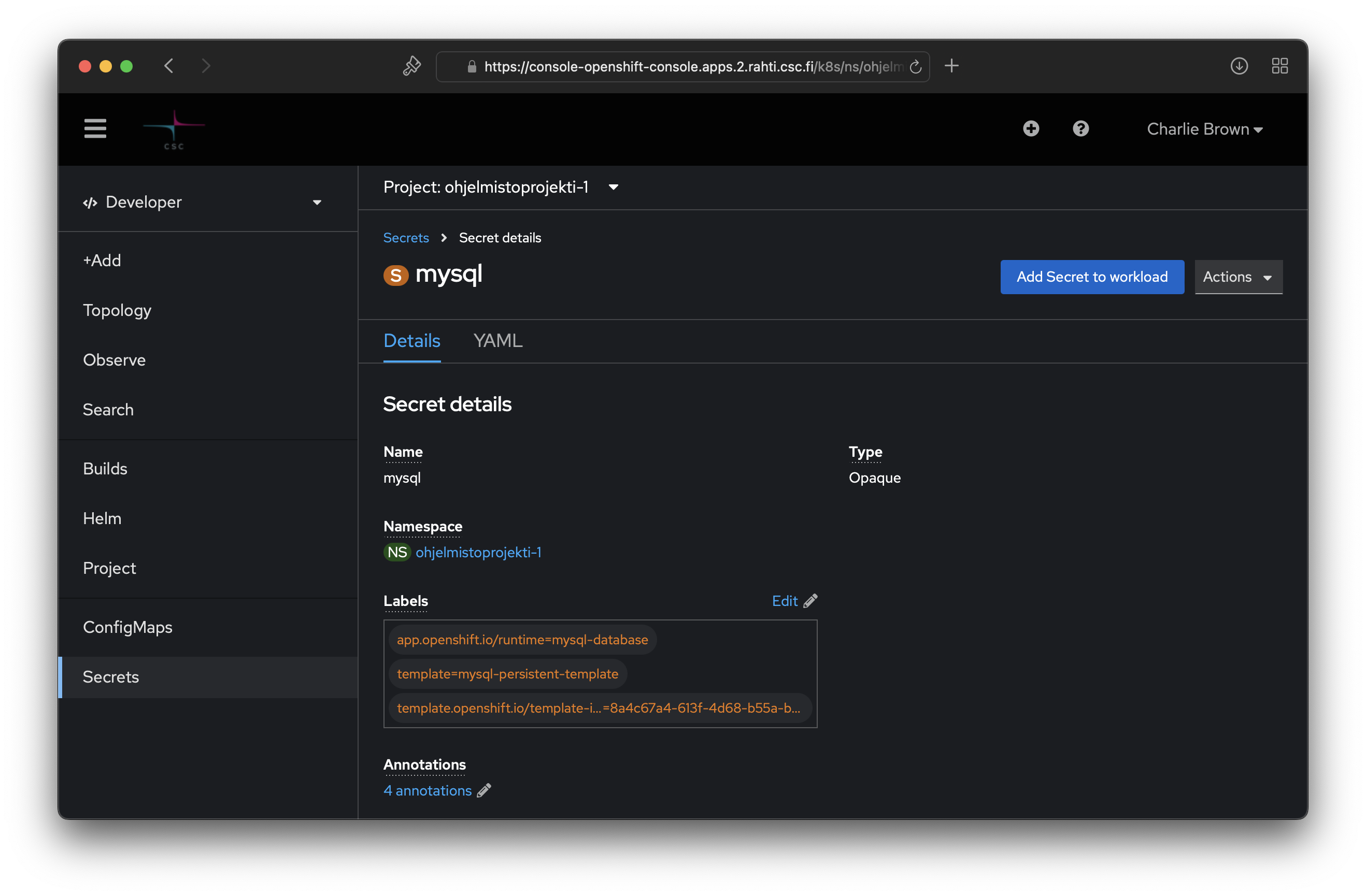 Salaisuudet (ja muut vastaavat resurssit) löytyvät Rahti-palvelun web-käyttöliittymästä Administrator/Workloads-valikon alta. Pelkät salaisuudet on nähtävillä myös valikosta Developer/Secrets.
